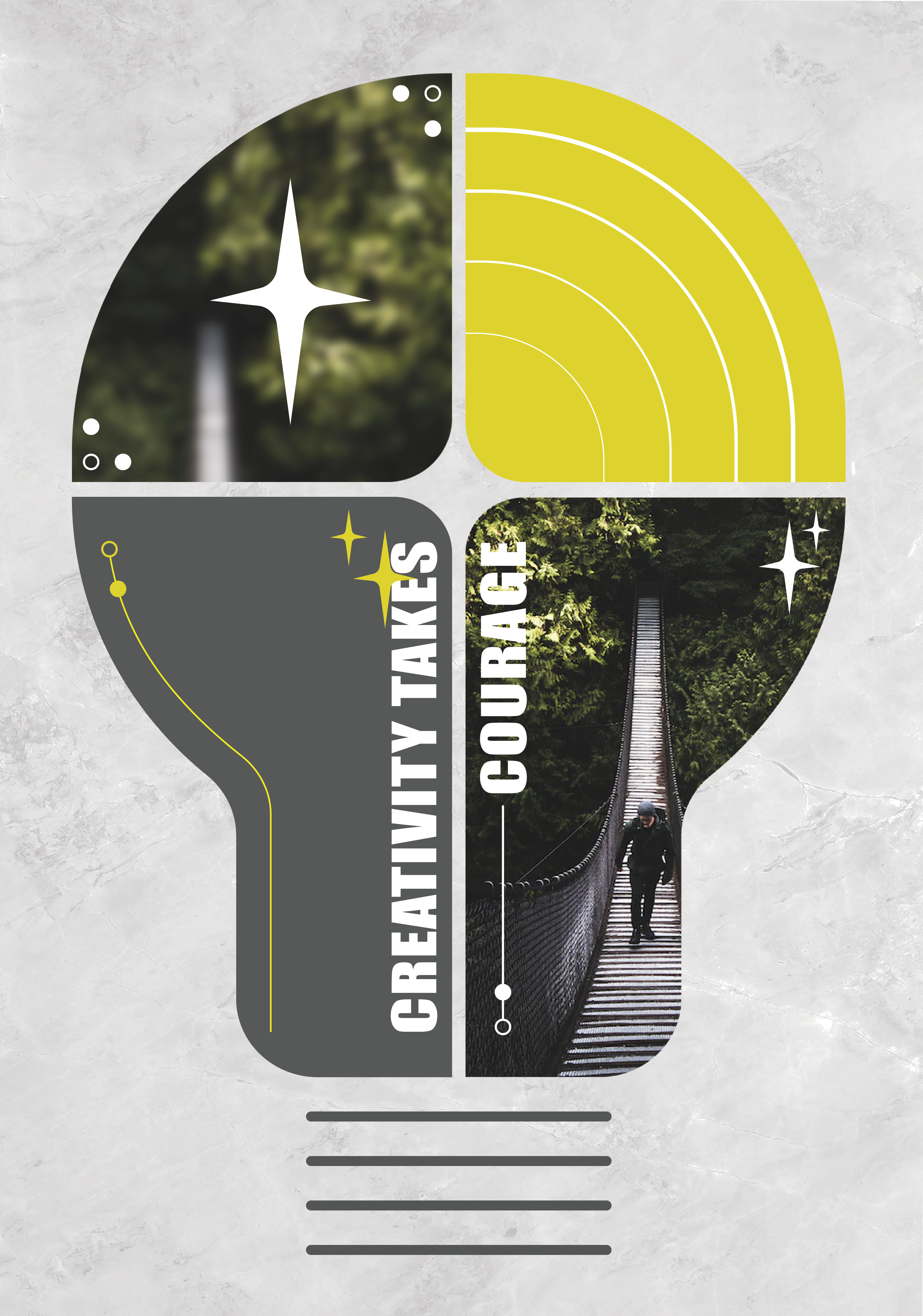 For this design, I drew inspiration from the quote “Creativity takes courage,” aiming to visually represent its meaning in a compelling and cohesive way. My goal was to ensure that both the design and the message complemented each other, reinforcing the essence of creative bravery. Through my choice of composition, typography, and visual elements, I sought to capture the boldness and risk-taking nature of creativity. By integrating my own design aesthetic, I worked to create a piece that not only communicates the quote effectively but also embodies its spirit, making the design feel both personal and impactful.